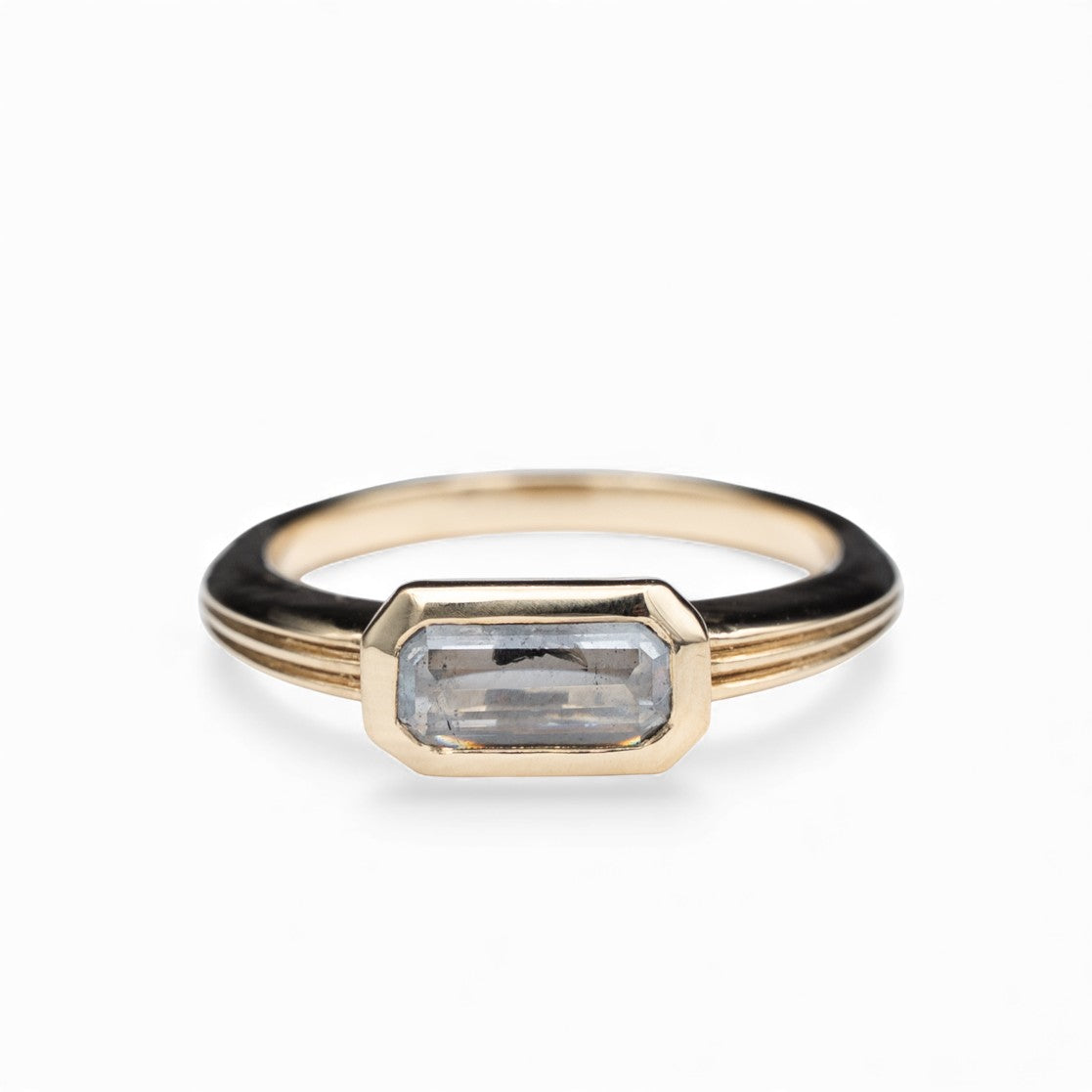 Smoky flecks drift through a mostly clear diamond, giving this ring its ember-lit character. The emerald-cut salt & pepper diamond is bezel-set in rich 14k yellow gold, paired with a fluted band that adds sculptural depth. Its bold top profile tapers gently at the back, balancing presence with comfortable, everyday wear.