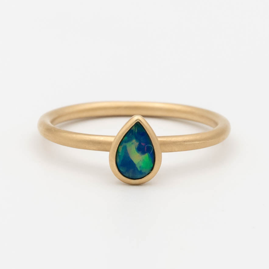 Named for Selene, goddess of the moon, this ring glows with shifting light and hidden depths. At its center is a vivid pear-shaped opal, alive with a play of blues and greens that shimmer like moonlight on water.