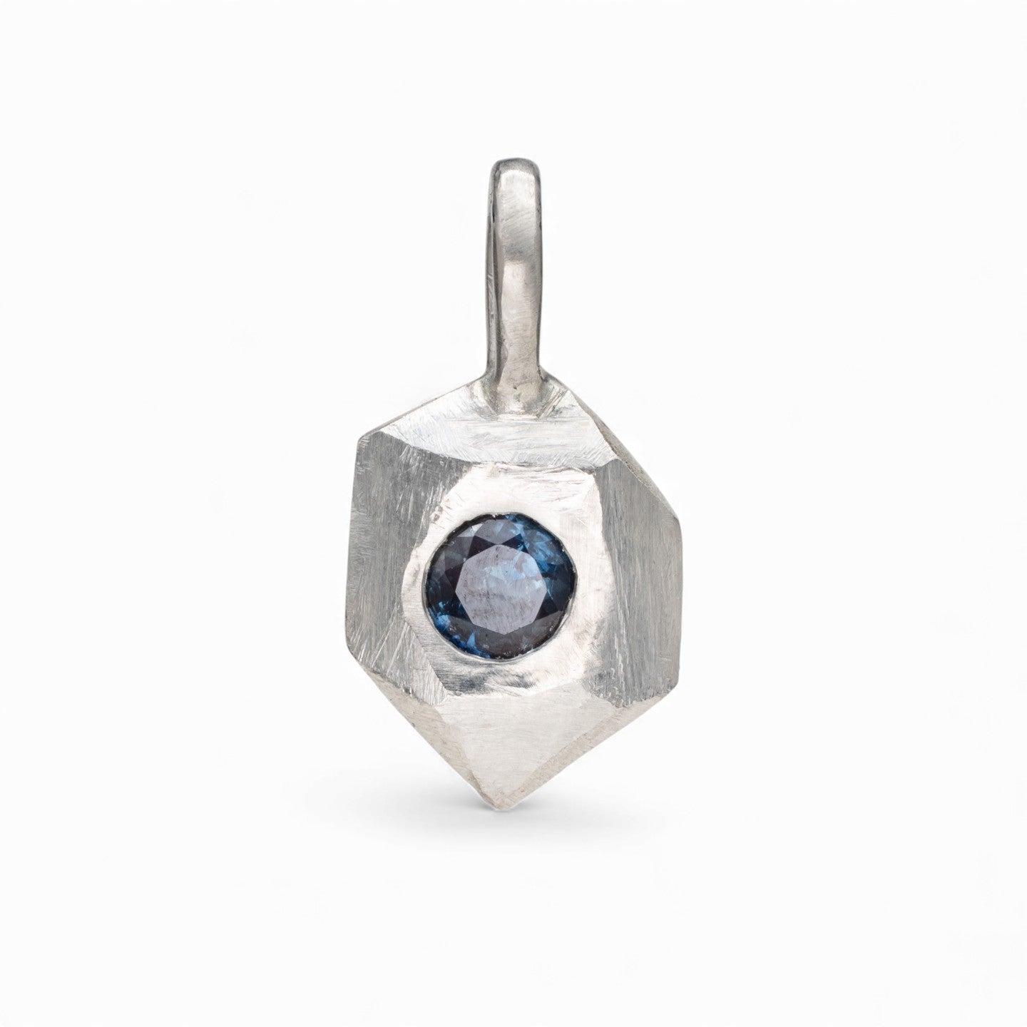 Hand-carved in sterling silver, the Teal Lantern Charm features a deep teal Montana sapphire set into a sculptural, faceted form. The angular silhouette feels like a small gemstone lantern or a naturally broken crystal, each plane shaped by hand for an organic, lightly rugged texture. The sapphire’s cool, moody blue glows against the soft silver, giving the piece a quiet but compelling presence.