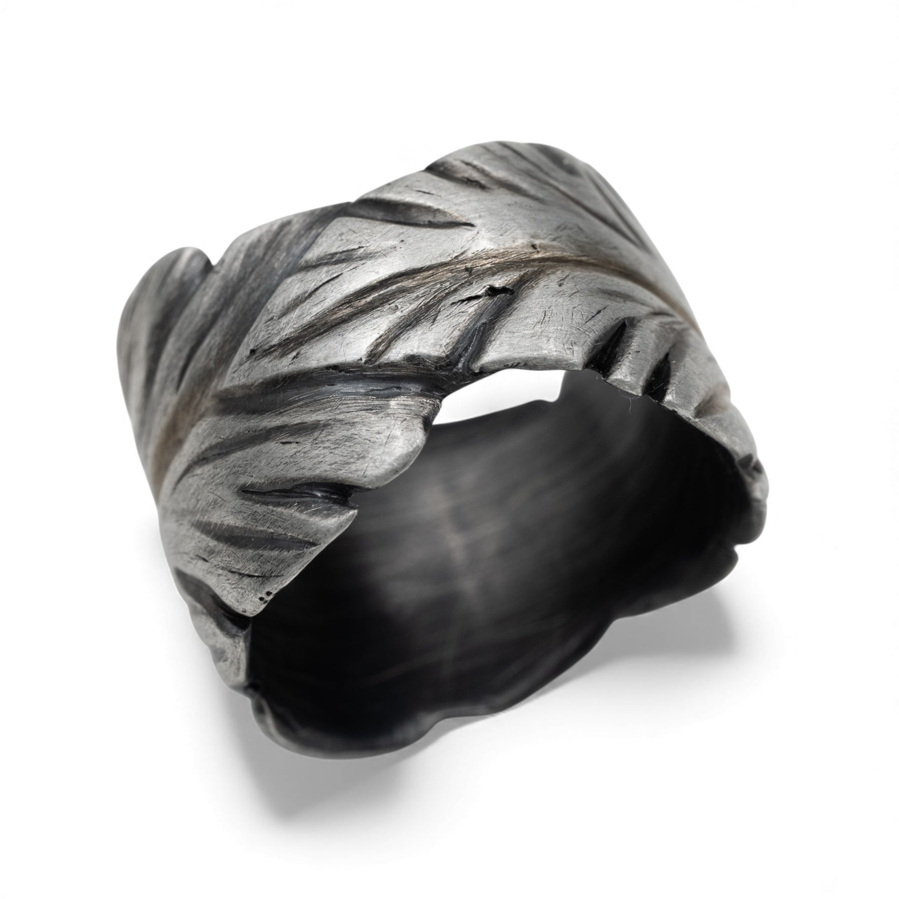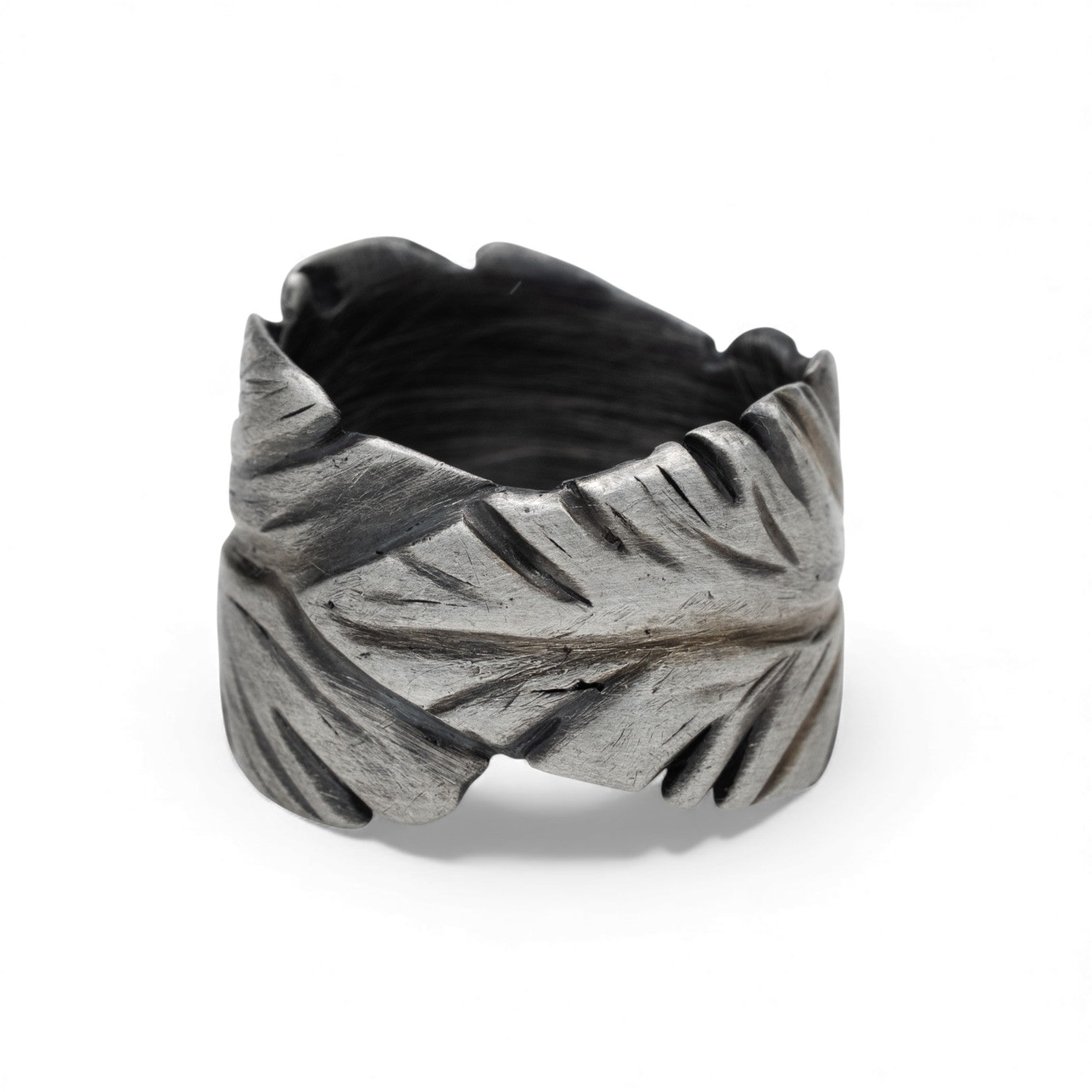 The Verda Band is a hand-carved sterling silver ring featuring wide leaves that join to curve naturally around the finger. Cast directly from an original wax carving, it carries organic texture and subtle movement, giving the piece the quiet presence of something shaped by hand rather than machine. The form is smooth, tactile, and easy to wear.