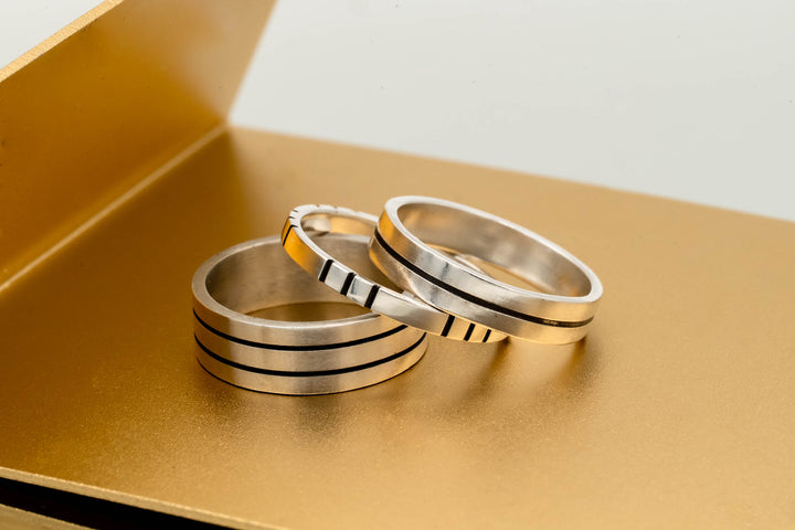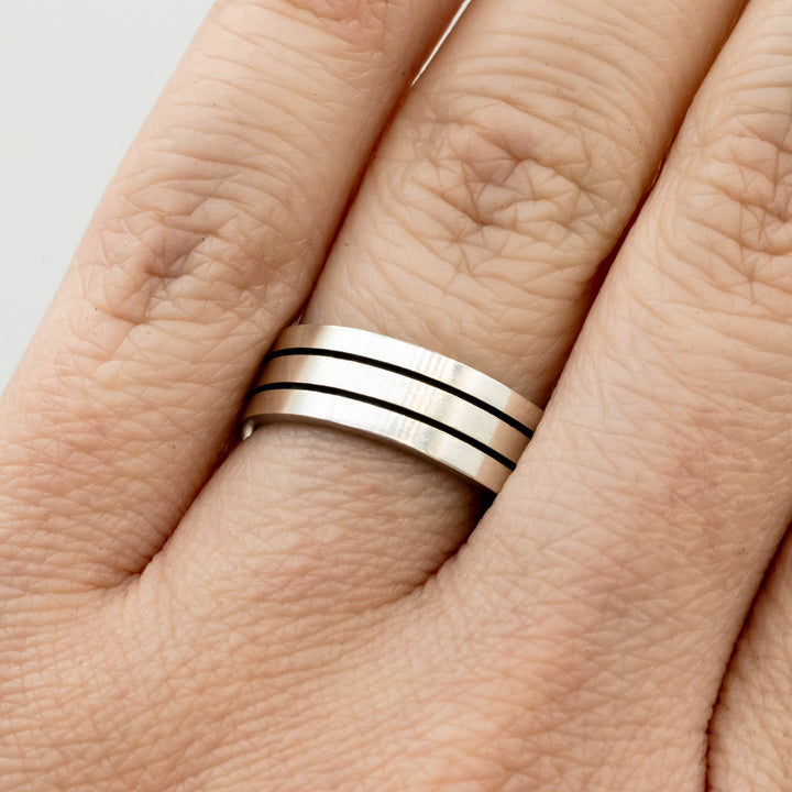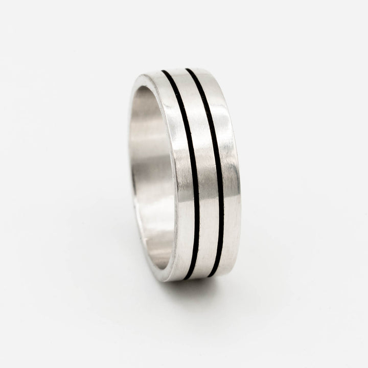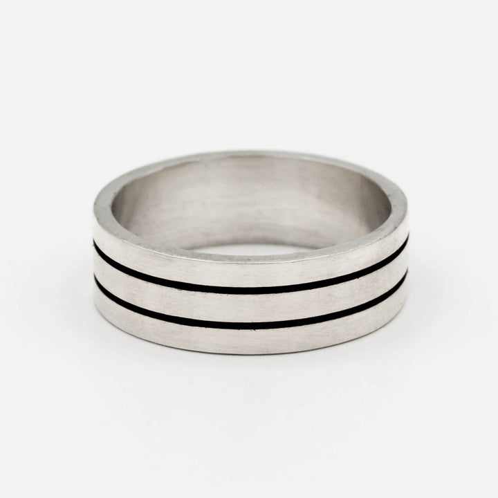 The Parallel Band is a 6mm flat ring featuring two engraved lines running in perfect symmetry. With clean edges and a bold profile, this band draws inspiration from modern architecture—precise, minimal, and beautifully grounded. Whether worn as a wedding band or a personal statement, its double-line detail symbolizes balance, duality, and connection.